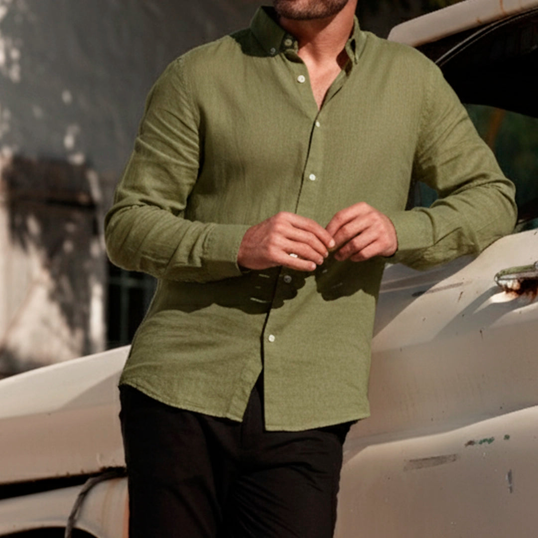 Gracias a su tejido ligero y transpirable, es perfecta para quienes buscan una prenda fresca y sofisticada. Ya sea que la uses con el cuello abierto para un look relajado o combinada con un traje para un evento más elegante, esta camisa se adapta fácilmente a tu estilo de vida. Disponible en colores neutros que combinan con todo, se convertirá en un básico en tu guardarropa.